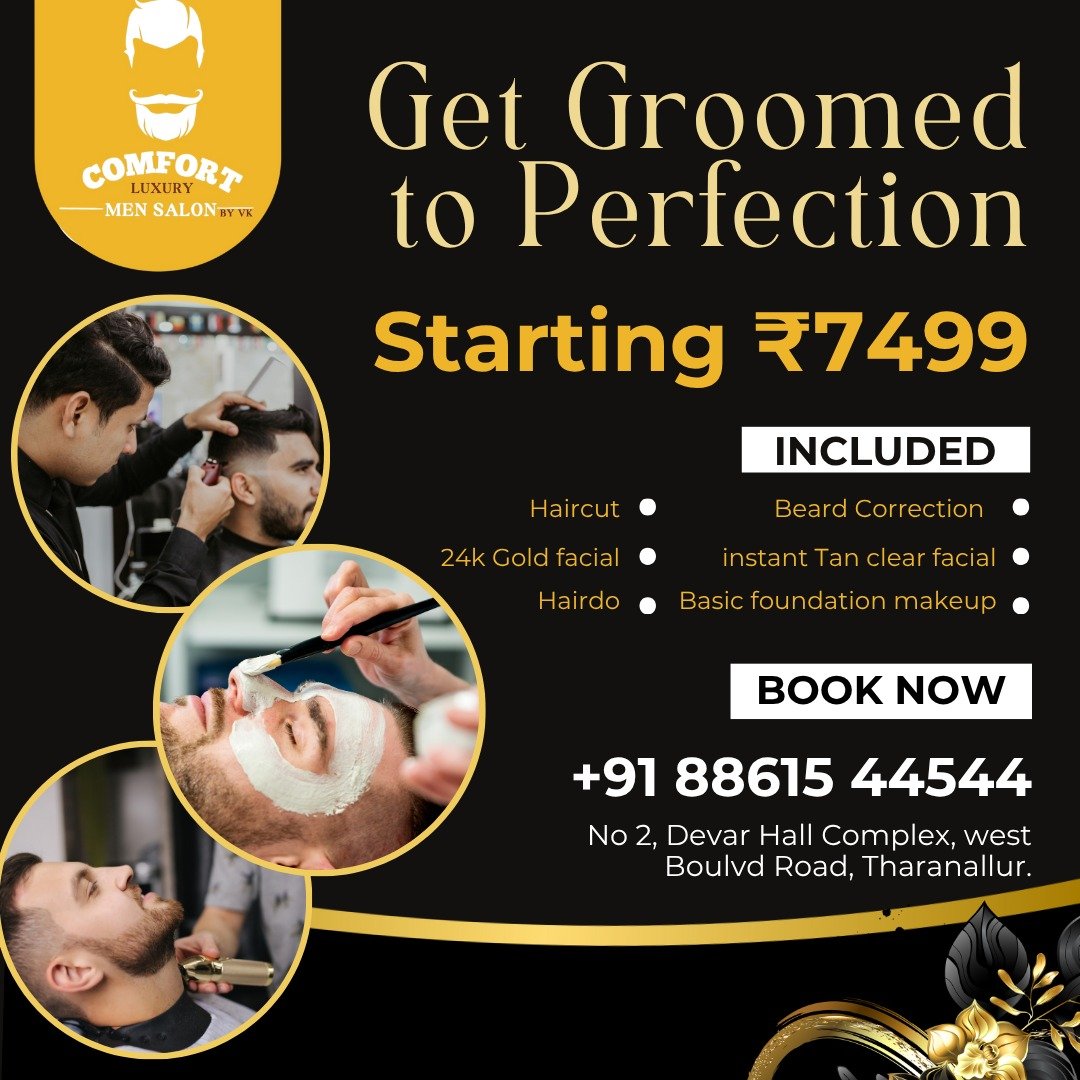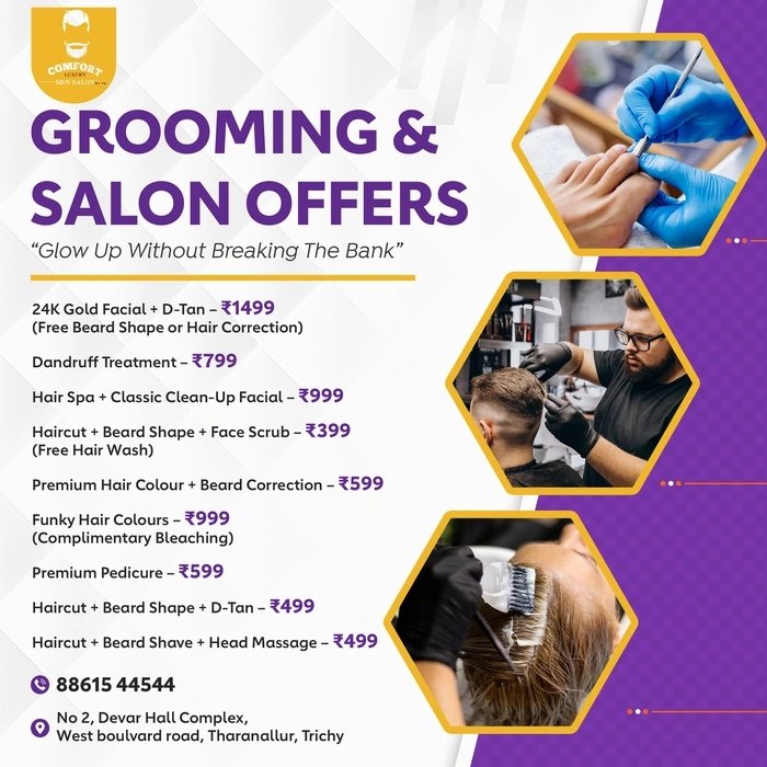 Comfort Luxury Men's Salon is your premier destination in Tiruchirappalli for exceptional grooming and relaxation. Located on West Boulevard Road in Singarathope, we offer a comprehensive range of services including classic barbering, modern haircuts, and styling. As a distinguished beauty parlour and hairdresser, we provide a comfortable and luxurious environment where men can unwind and receive top-notch care. Our skilled team is dedicated to delivering personalized services tailored to your individual needs and preferences. Visit us at No 2, Devar Hall and experience the perfect blend of style and comfort. skin care hair professional hair skin care products styling coloring skin care coloring skin care services